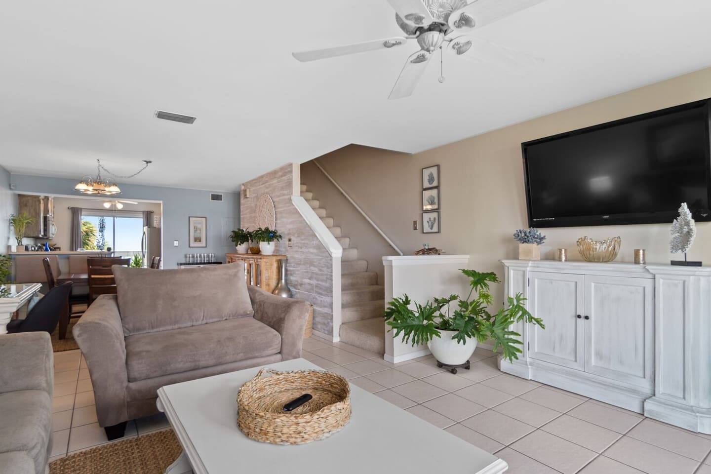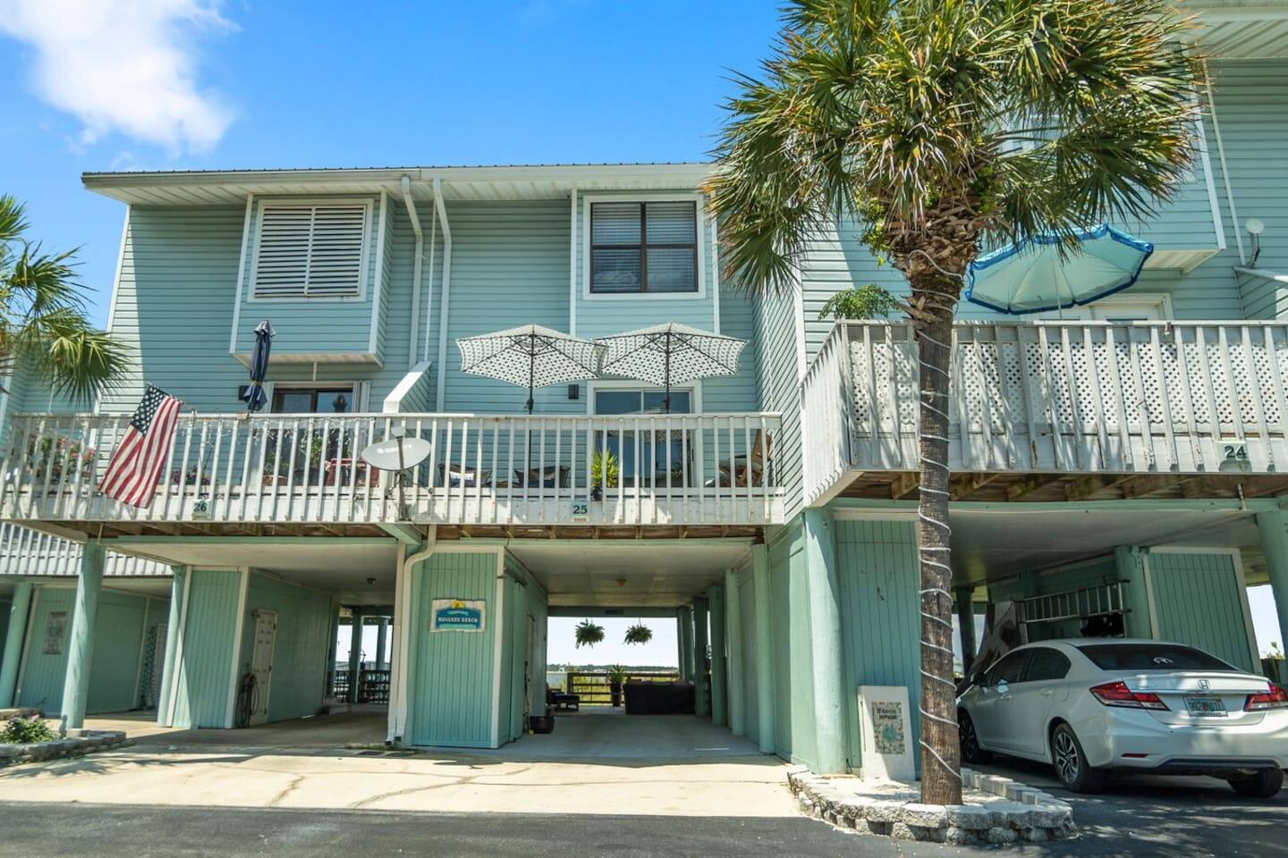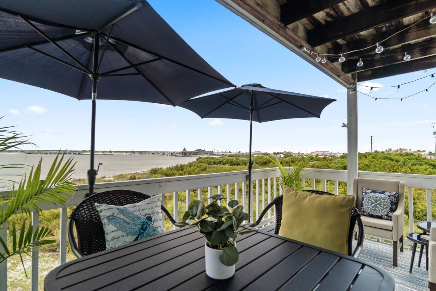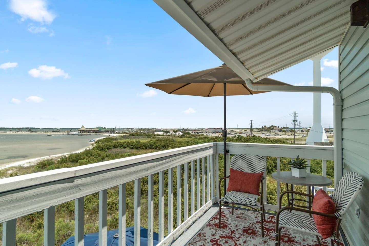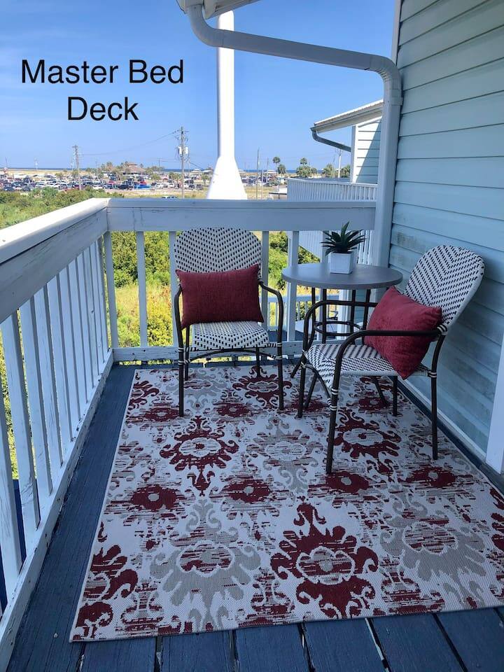 This unit is 3 levels with the main living area located on the 2nd floor and bedrooms on the 3rd floor. Offering 3 large balconies, 2 with comfortable furnishings that include: lounge chairs, a dining table with four chairs, a bistro table and, both decks are finished off with colorful umbrellas in case you need a break from the sun. It's the perfect setting to kick back and relax with a cup of coffee while enjoying the sunrise off the Master Bedroom or Living Room deck. Or, grab your favorite beverage while checking out the boats, dolphins, sunsets and all kinds of fun water activities. Additionally, there is a large deck on the bottom level, complete with a spacious, circular couch and table. From here, you can walk down to the beach just a few steps away. The unit is spacious with a fully stocked Kitchen that includes a balcony with views of the pool. Direct views of the water from the tastefully decorated Living Room which has a couch, love seat, coffee table and large TV. A guest Bathroom, equipped with a tub/shower combination rounds out the main floor. The Main Bedroom offers a King Bed, plenty of closet space and a balcony with views of the water. The 2nd Bedroom also offers plenty of closet space and a Queen Bed. The 2nd Bathroom with shower / tub combination is also located on the 3rd floor. This unit is conveniently located directly across the street from the Gulf of Mexico and an easy walk to restaurants, fishing and night life. There is a queen size air mattress with sheets in the Guest Bedroom if you require extra sleep accommodations.