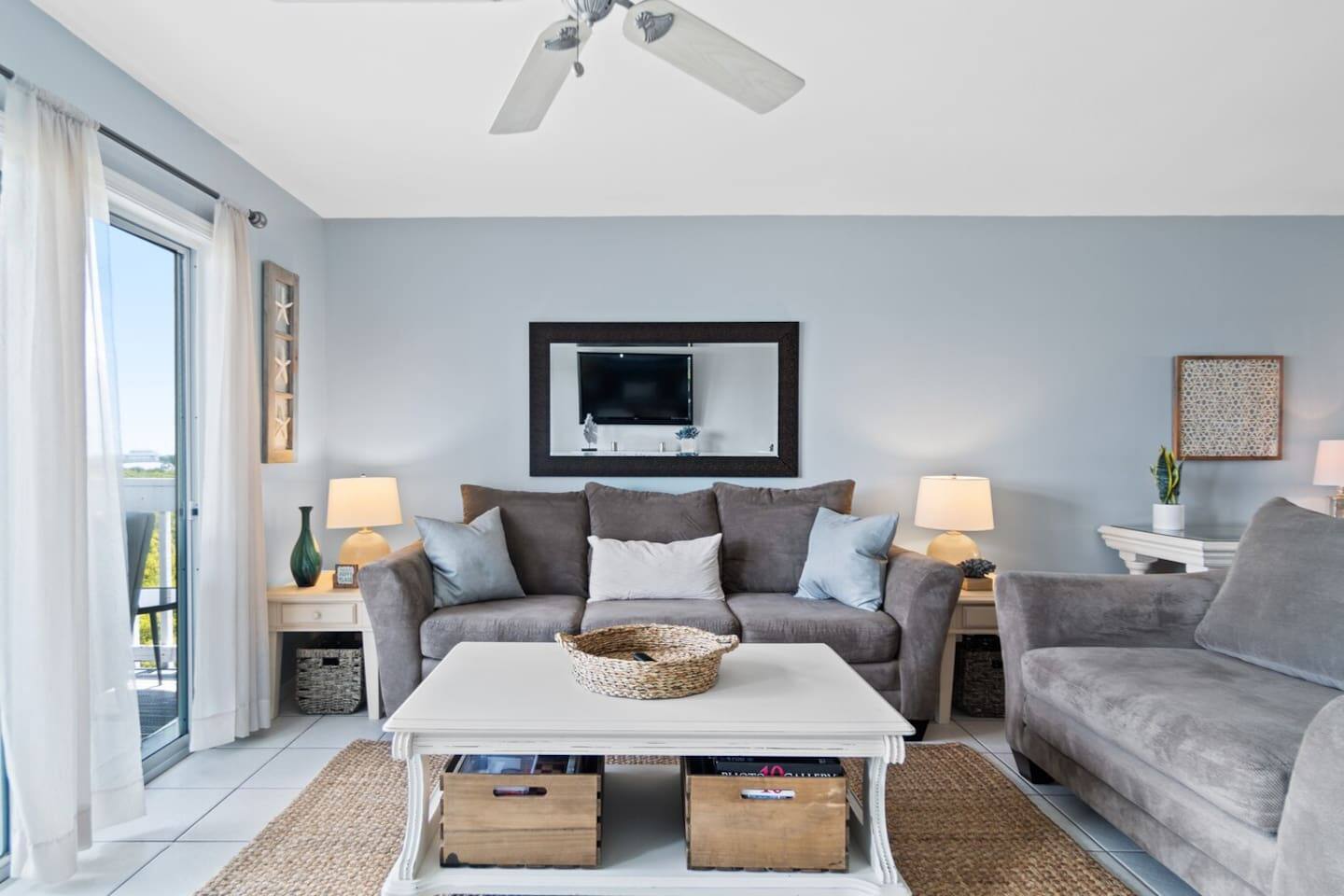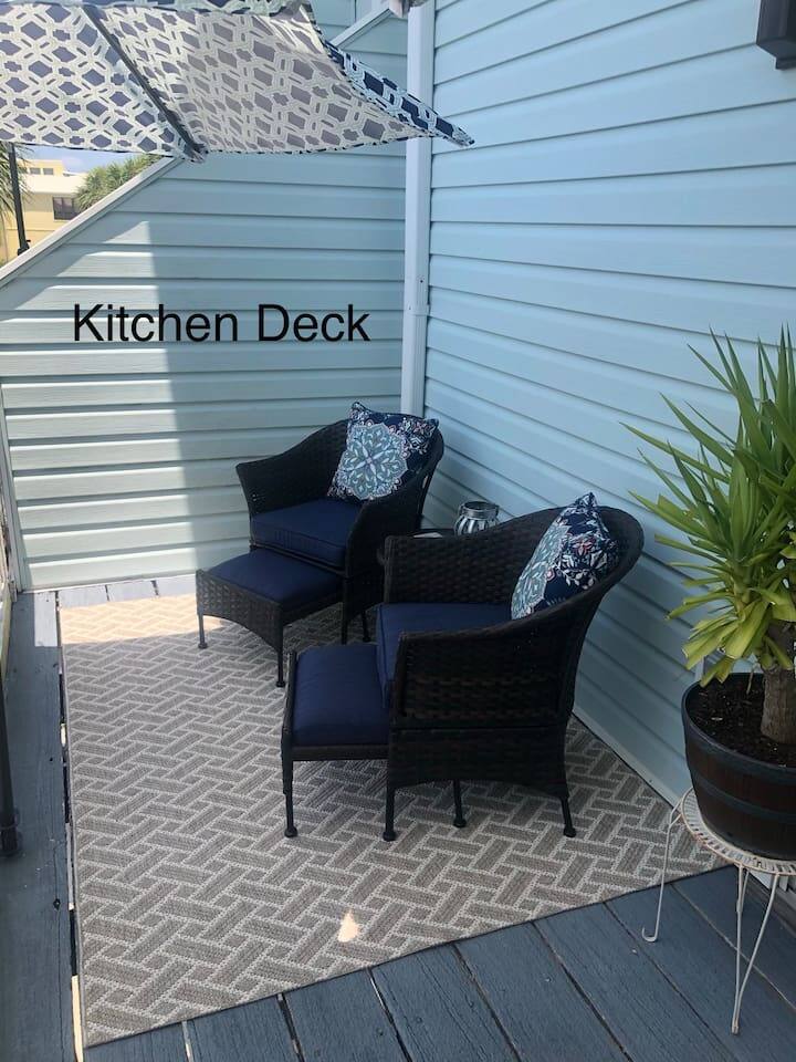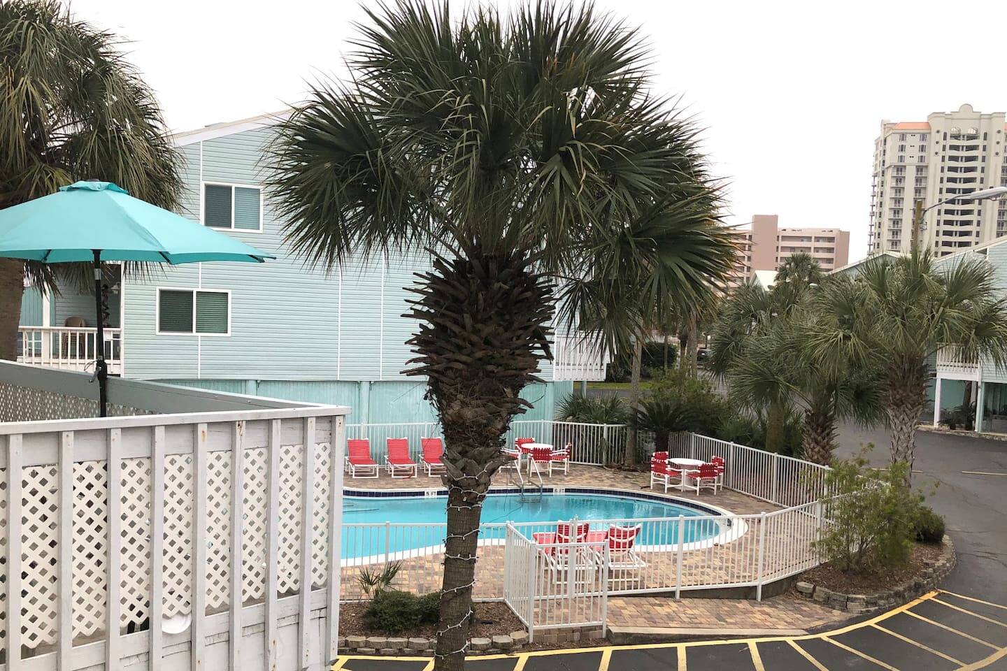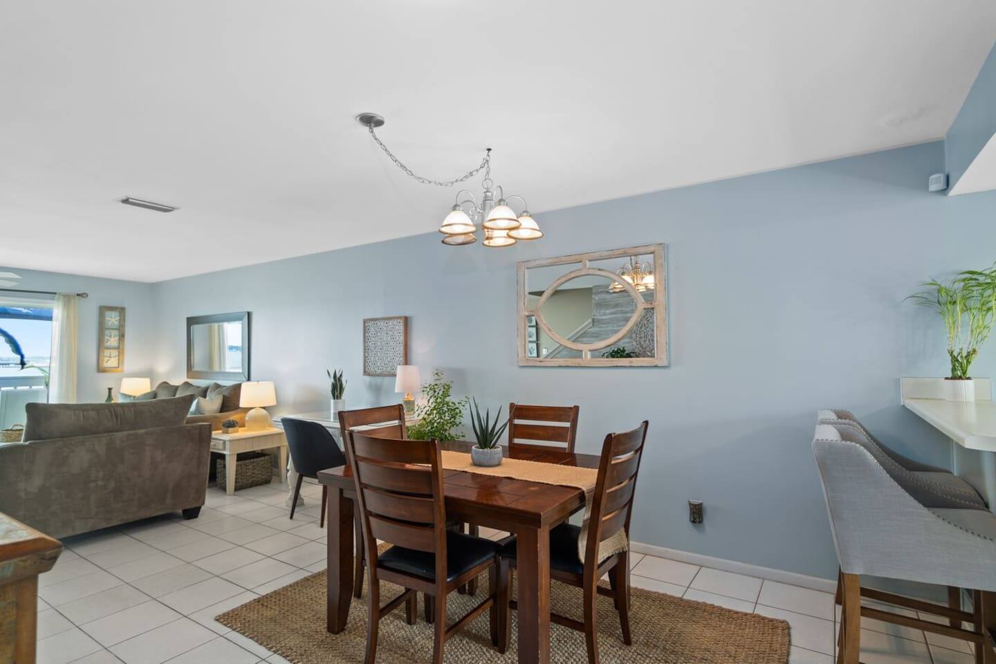 This unit is 3 levels with the main living area located on the 2nd floor and bedrooms on the 3rd floor. Offering 3 large balconies, 2 with comfortable furnishings that include: lounge chairs, a dining table with four chairs, a bistro table and, both decks are finished off with colorful umbrellas in case you need a break from the sun. It's the perfect setting to kick back and relax with a cup of coffee while enjoying the sunrise off the Master Bedroom or Living Room deck. Or, grab your favorite beverage while checking out the boats, dolphins, sunsets and all kinds of fun water activities. Additionally, there is a large deck on the bottom level, complete with a spacious, circular couch and table. From here, you can walk down to the beach just a few steps away. The unit is spacious with a fully stocked Kitchen that includes a balcony with views of the pool. Direct views of the water from the tastefully decorated Living Room which has a couch, love seat, coffee table and large TV. A guest Bathroom, equipped with a tub/shower combination rounds out the main floor. The Main Bedroom offers a King Bed, plenty of closet space and a balcony with views of the water. The 2nd Bedroom also offers plenty of closet space and a Queen Bed. The 2nd Bathroom with shower / tub combination is also located on the 3rd floor. This unit is conveniently located directly across the street from the Gulf of Mexico and an easy walk to restaurants, fishing and night life. There is a queen size air mattress with sheets in the Guest Bedroom if you require extra sleep accommodations.